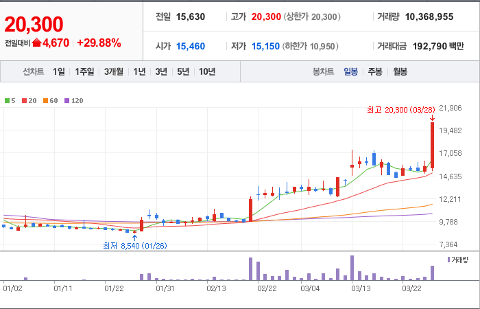 현재가: 20,300, 어제대비:+4,670시총: 4,604억원, 거래량:10,368,955, 거래대금:192,790백만