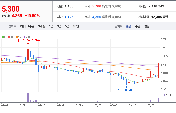 현재가: 5,300, 어제대비:+865시총: 1,602억원, 거래량:2,410,349, 거래대금:12,405백만