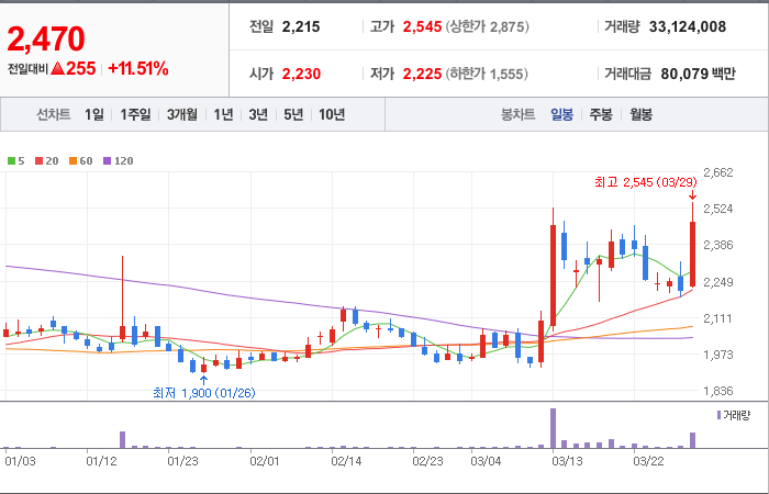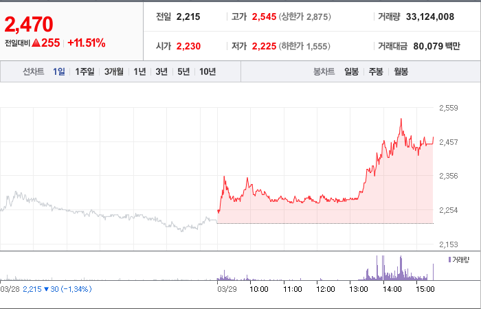 현재가: 2,470, 어제대비:+255시총: 5,084억원, 거래량:33,123,142, 거래대금:80,077백만