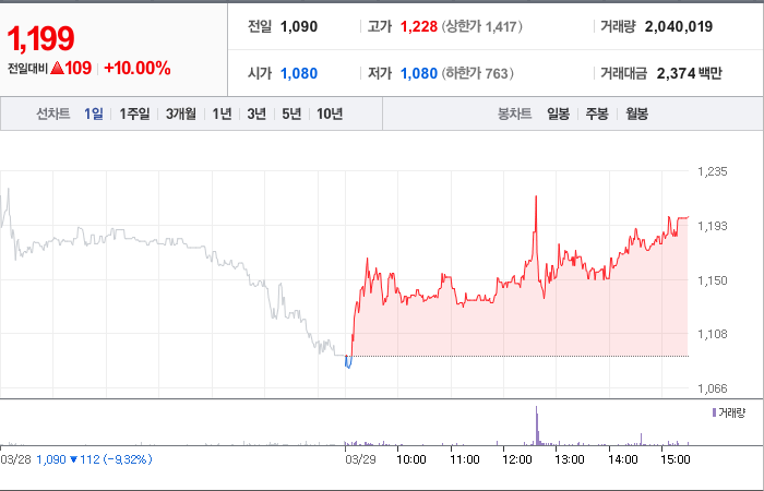 현재가: 1,199, 어제대비:+109시총: 810억원, 거래량:2,037,056, 거래대금:2,371백만