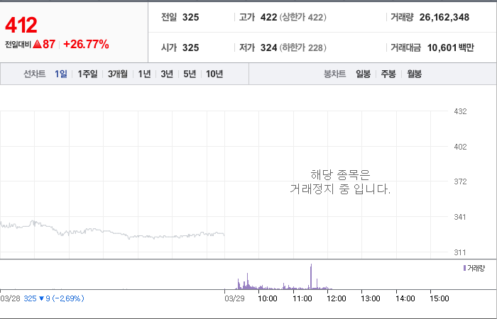 현재가: 412, 어제대비:+87시총: 228억원, 거래량:26,162,348, 거래대금:10,601백만