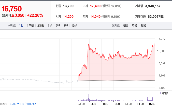 현재가: 16,750, 어제대비:+3,050시총: 1,530억원, 거래량:3,947,537, 거래대금:62,996백만