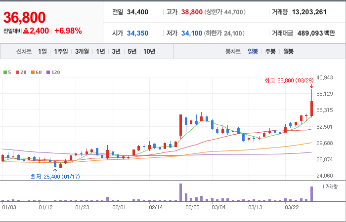 현재가: 36,800, 어제대비:+2,400시총: 4조 164억원, 거래량:13,201,826, 거래대금:489,041백만