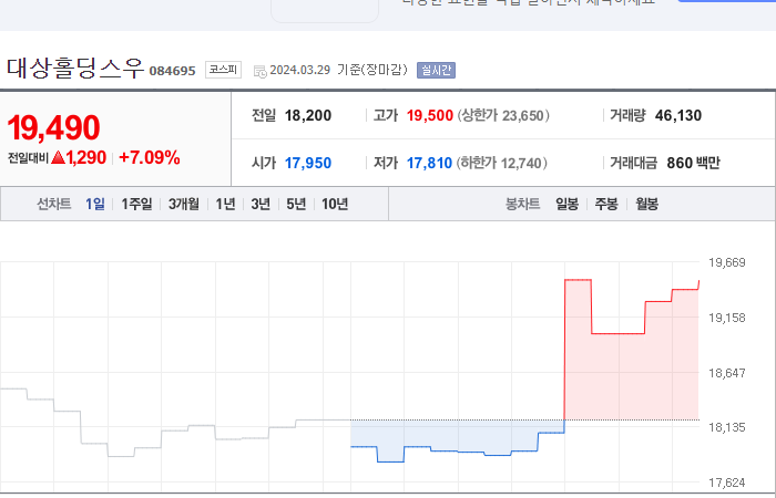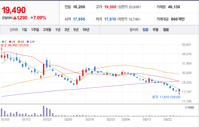 현재가: 19,490, 어제대비:+1,290시총: 178억원, 거래량:45,783, 거래대금:854백만