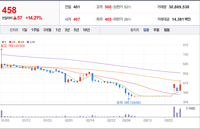 현재가: 458, 어제대비:+57시총: 776억원, 거래량:30,868,488, 거래대금:14,380백만
