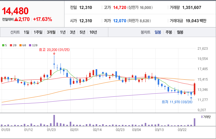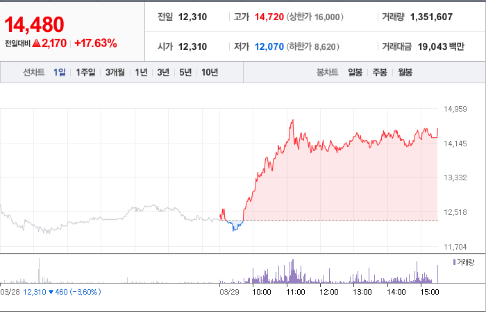 현재가: 14,480, 어제대비:+2,170시총: 1,420억원, 거래량:1,334,074, 거래대금:18,789백만