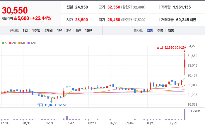 현재가: 30,550, 어제대비:+5,600시총: 2,293억원, 거래량:1,957,133, 거래대금:60,123백만