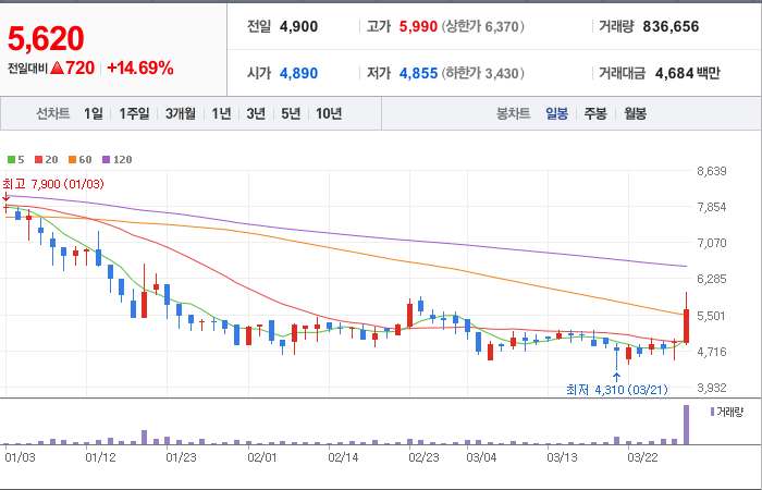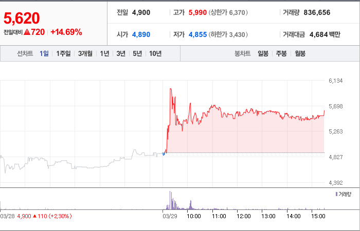 현재가: 5,620, 어제대비:+720시총: 870억원, 거래량:836,656, 거래대금:4,684백만