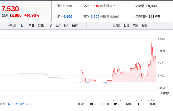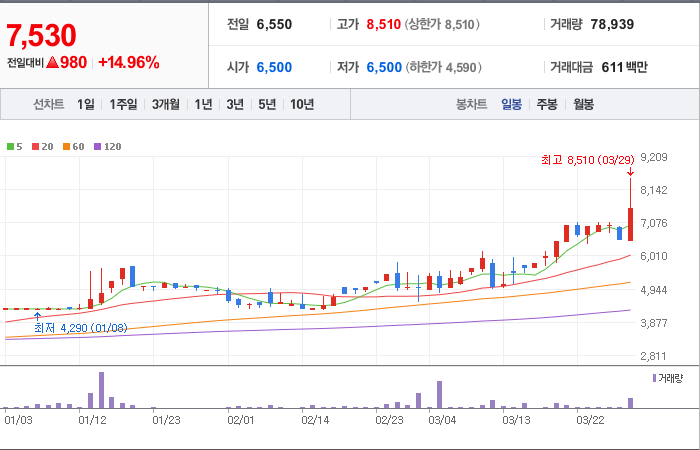 현재가: 7,530, 어제대비:+980시총: 2,022억원, 거래량:78,889, 거래대금:610백만
