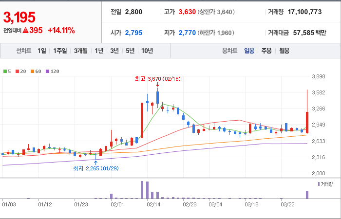 현재가: 3,195, 어제대비:+395시총: 9,915억원, 거래량:17,041,739, 거래대금:57,397백만