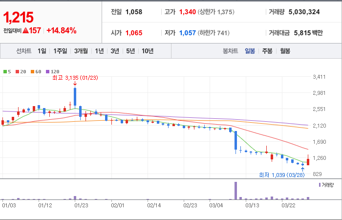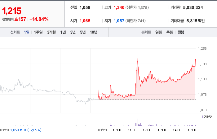 현재가: 1,215, 어제대비:+157시총: 919억원, 거래량:5,030,148, 거래대금:5,815백만