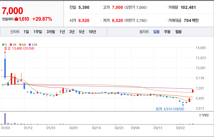 현재가: 7,000, 어제대비:+1,610시총: 87억원, 거래량:102,451, 거래대금:704백만
