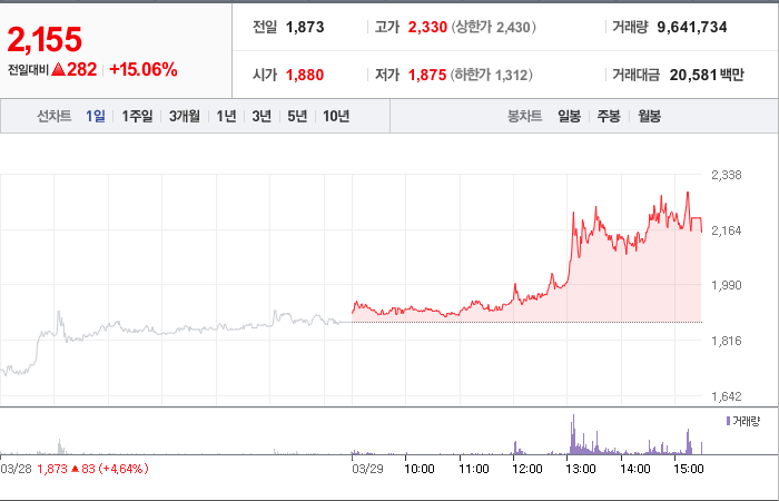 현재가: 2,155, 어제대비:+282시총: 900억원, 거래량:9,641,630, 거래대금:20,580백만