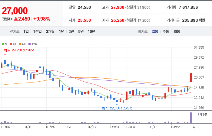 현재가: 27,000, 어제대비:+2,450시총: 1조 3,343억원, 거래량:7,617,856, 거래대금:205,893백만