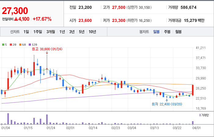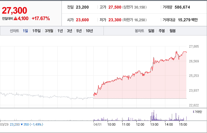 현재가: 27,300, 어제대비:+4,100시총: 3,419억원, 거래량:586,674, 거래대금:15,279백만