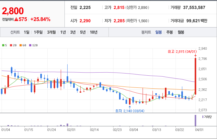 현재가: 2,800, 어제대비:+575시총: 943억원, 거래량:37,553,587, 거래대금:99,621백만