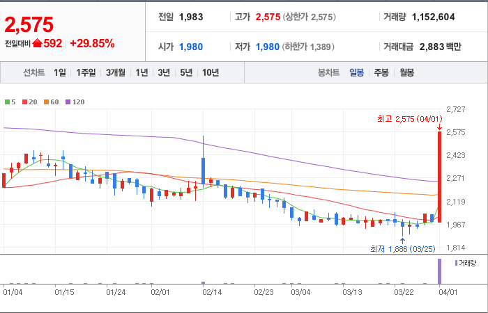 현재가: 2,575, 어제대비:+592시총: 492억원, 거래량:1,152,604, 거래대금:2,883백만