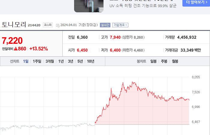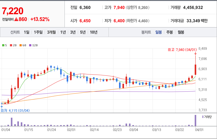 현재가: 7,220, 어제대비:+860시총: 1,737억원, 거래량:4,456,932, 거래대금:33,349백만