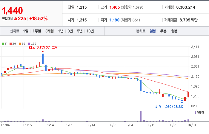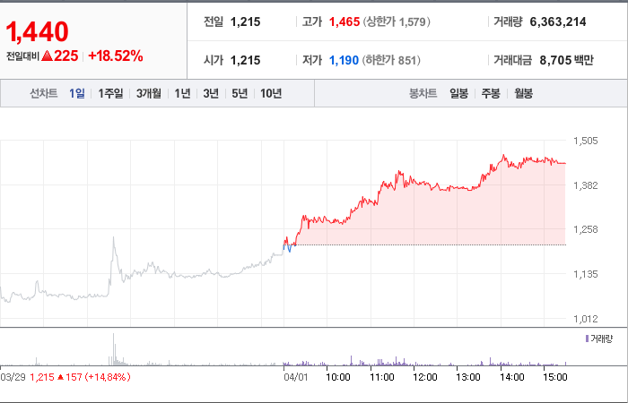 현재가: 1,440, 어제대비:+225시총: 1,089억원, 거래량:6,363,214, 거래대금:8,705백만