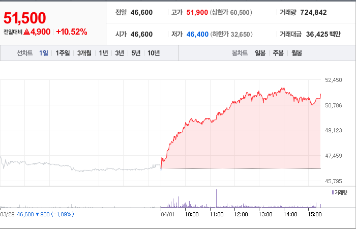 현재가: 51,500, 어제대비:+4,900시총: 1조 2,157억원, 거래량:724,842, 거래대금:36,425백만