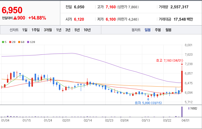 현재가: 6,950, 어제대비:+900시총: 1,117억원, 거래량:2,557,3172,557,317, 거래대금:17,54817,548백만