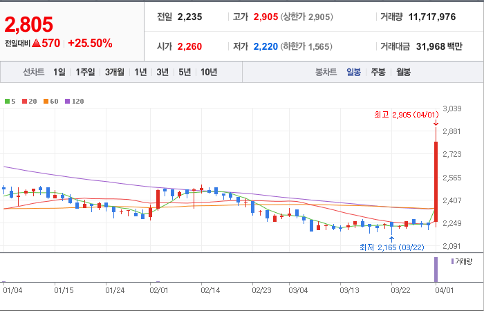 현재가: 2,805, 어제대비:+570시총: 1,005억원, 거래량:11,717,976, 거래대금:31,968백만