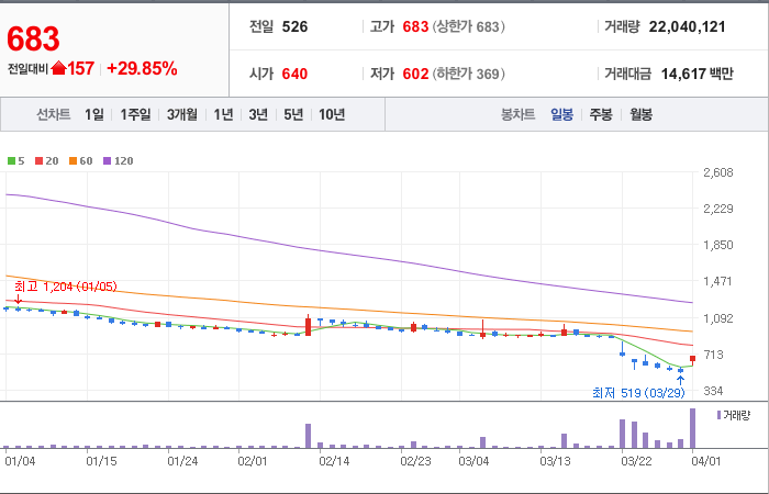 현재가: 683, 어제대비:+157시총: 621억원, 거래량:22,040,121, 거래대금:14,617백만