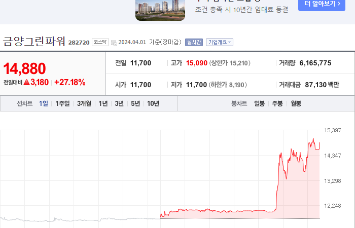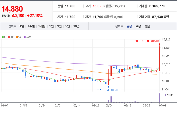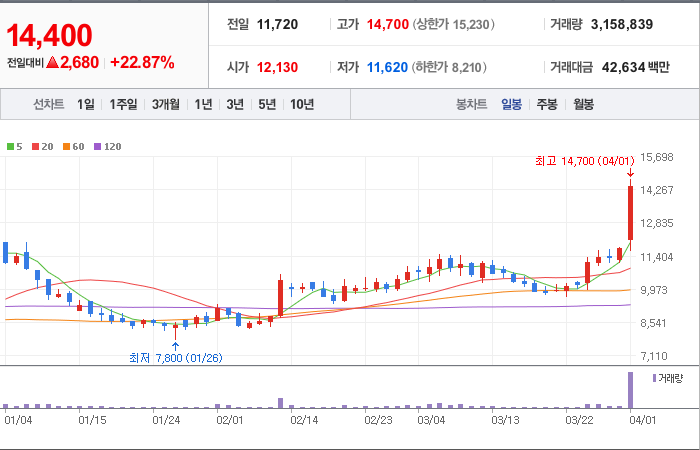 현재가: 14,880, 어제대비:+3,180시총: 1,803억원, 거래량:6,165,775, 거래대금:87,130백만