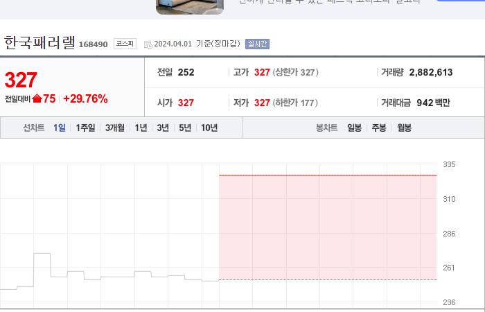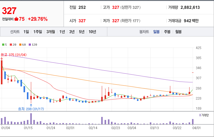 현재가: 327, 어제대비:+75시총: 262억원, 거래량:2,882,613, 거래대금:942백만