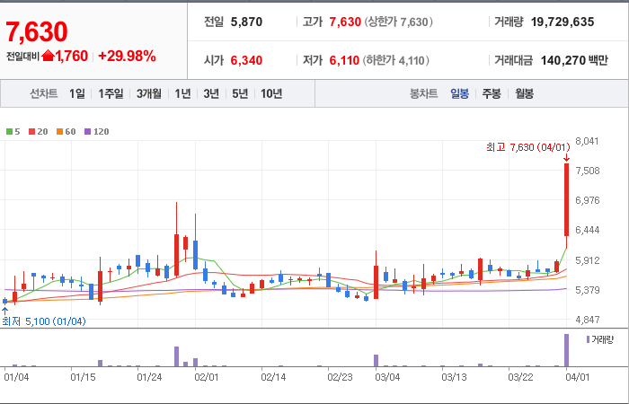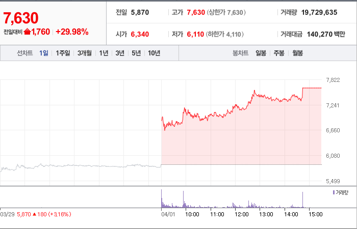 현재가: 7,630, 어제대비:+1,760시총: 1,237억원, 거래량:19,729,635, 거래대금:140,270백만