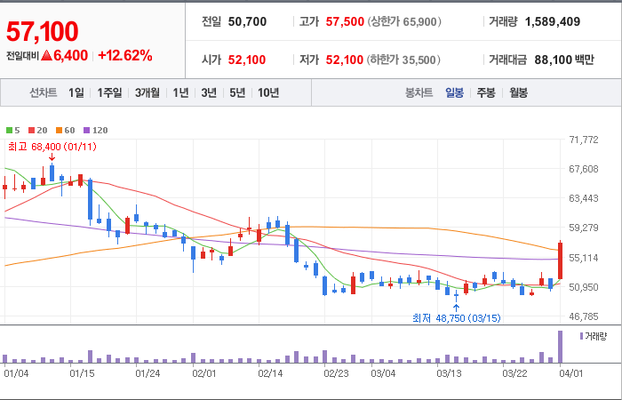 현재가: 57,100, 어제대비:+6,400시총: 2조 4,080억원, 거래량:1,589,409, 거래대금:88,100백만