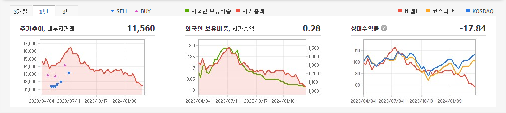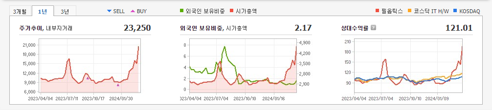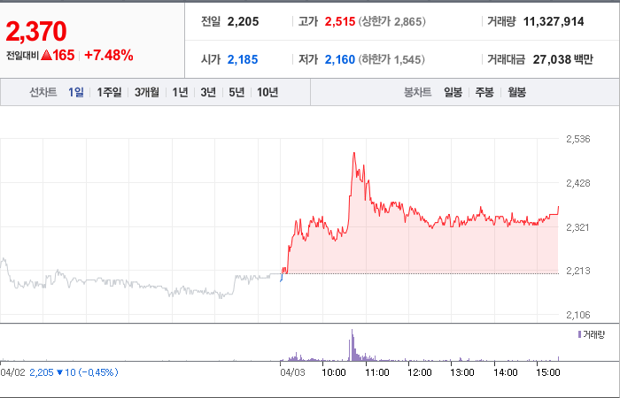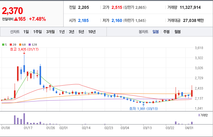 현재가: 2,370, 어제대비:+165시총: 1,137억원, 거래량:11,327,477, 거래대금:27,037백만