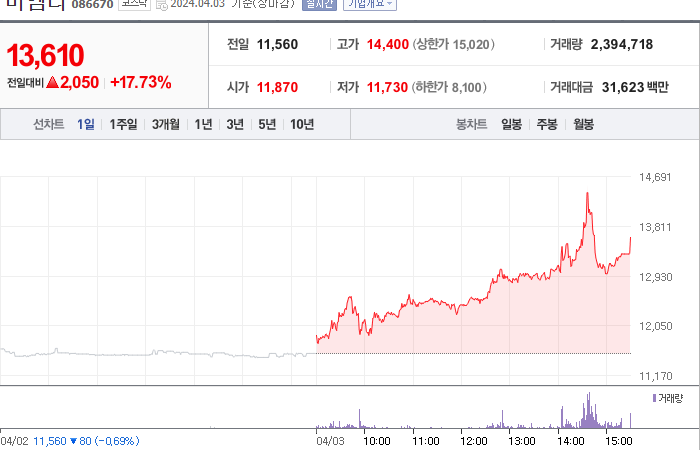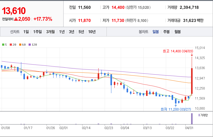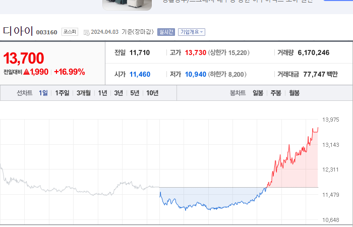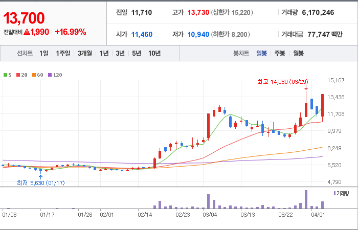 현재가: 13,700, 어제대비:+1,990시총: 3,877억원, 거래량:6,169,641, 거래대금:77,739백만