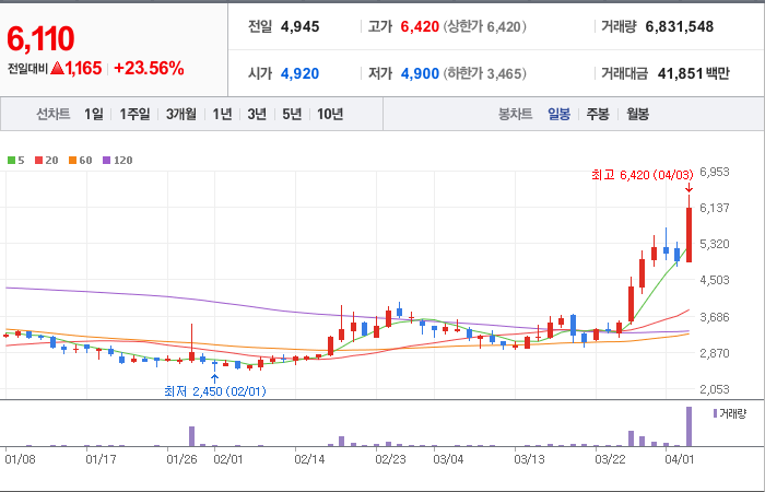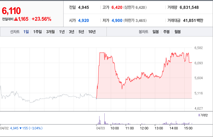 현재가: 6,110, 어제대비:+1,165시총: 1,444억원, 거래량:6,831,367, 거래대금:41,850백만