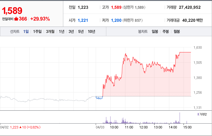 현재가: 1,589, 어제대비:+366시총: 762억원, 거래량:27,420,681, 거래대금:40,219백만