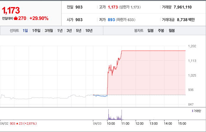 현재가: 1,173, 어제대비:+270시총: 523억원, 거래량:7,961,109, 거래대금:8,738백만