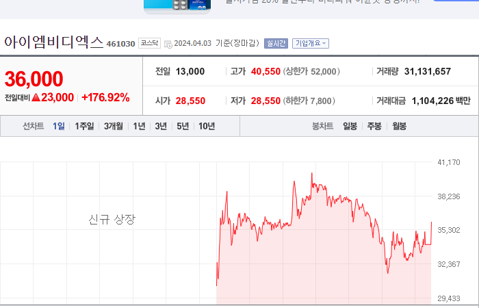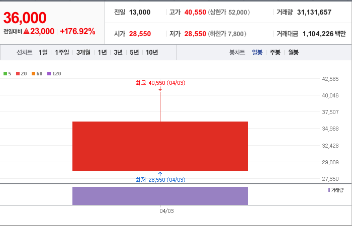 현재가: 36,000, 어제대비:+23,000시총: 5,037억원, 거래량:31,129,758, 거래대금:1,104,158백만