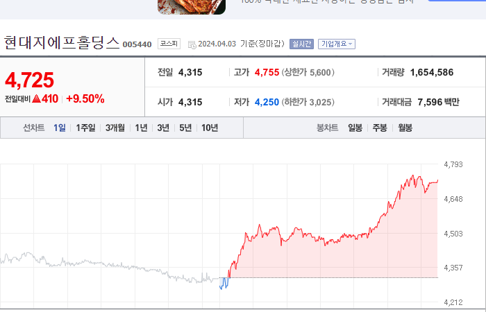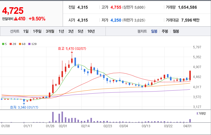 현재가: 4,725, 어제대비:+410시총: 7,366억원, 거래량:1,654,275, 거래대금:7,594백만