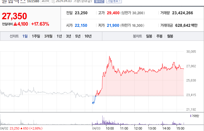 현재가: 27,350, 어제대비:+4,100시총: 6,203억원, 거래량:23,423,044, 거래대금:628,609백만