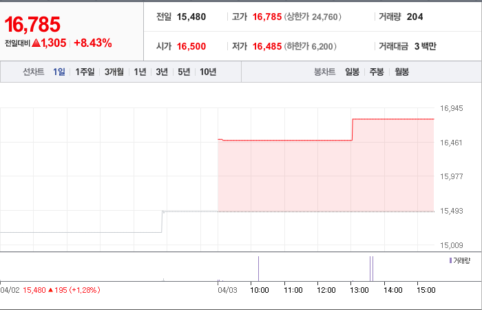 현재가: 16,785, 어제대비:+1,305시총: 168억원, 거래량:204, 거래대금:3백만