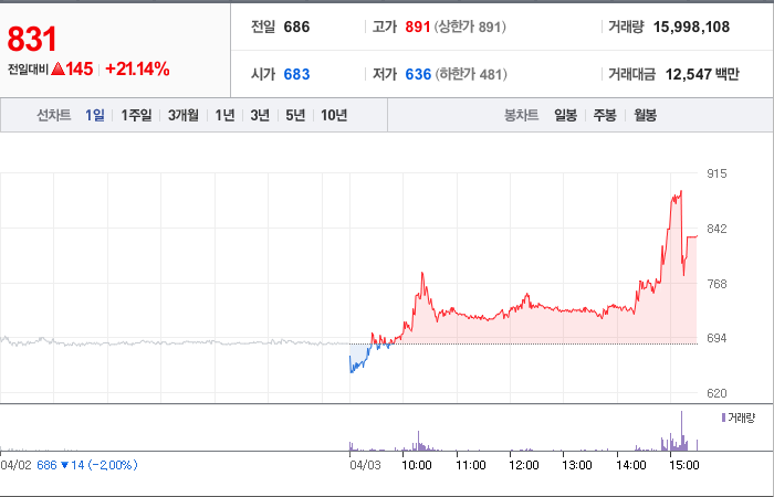 현재가: 831, 어제대비:+145시총: 434억원, 거래량:15,997,670, 거래대금:12,547백만