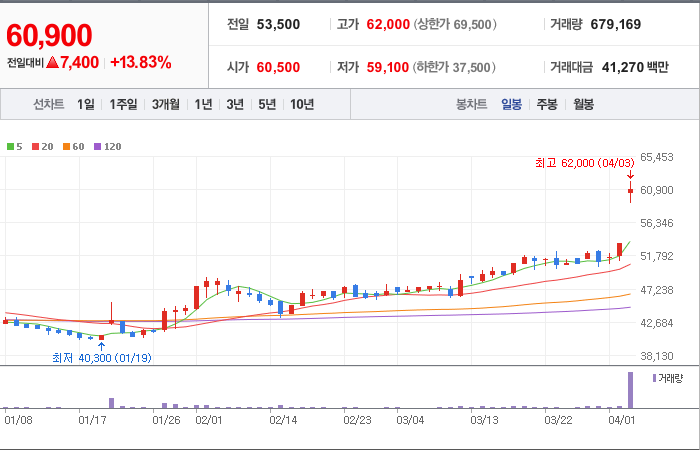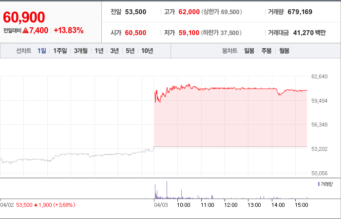 현재가: 60,900, 어제대비:+7,400시총: 7,308억원, 거래량:678,834, 거래대금:41,249백만