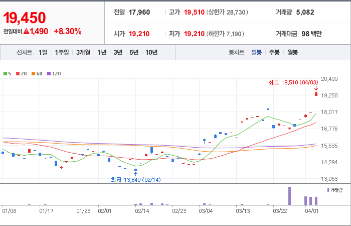 현재가: 19,450, 어제대비:+1,490시총: 194억원, 거래량:5,082, 거래대금:98백만