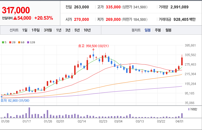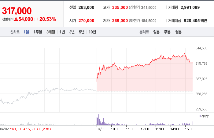 현재가: 317,000, 어제대비:+54,000시총: 5조 8,323억원, 거래량:2,991,059, 거래대금:928,396백만
