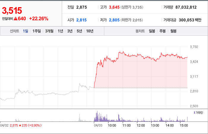 현재가: 3,515, 어제대비:+640시총: 8,451억원, 거래량:86,995,866, 거래대금:299,924백만