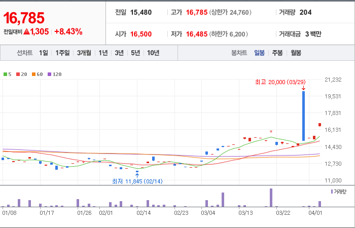 현재가: 16,735, 어제대비:+1,250시총: 167억원, 거래량:6,059, 거래대금:101백만