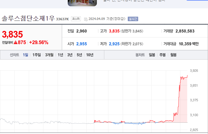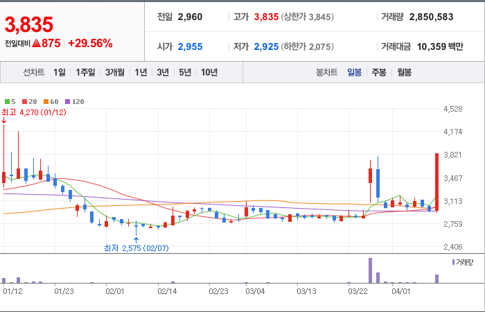 현재가: 3,835, 어제대비:+875시총: 648억원, 거래량:2,850,583, 거래대금:10,359백만