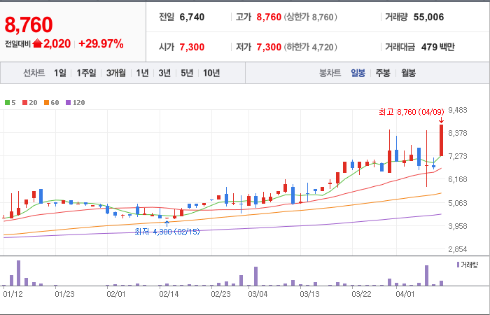 현재가: 8,760, 어제대비:+2,020시총: 2,352억원, 거래량:55,006, 거래대금:479백만