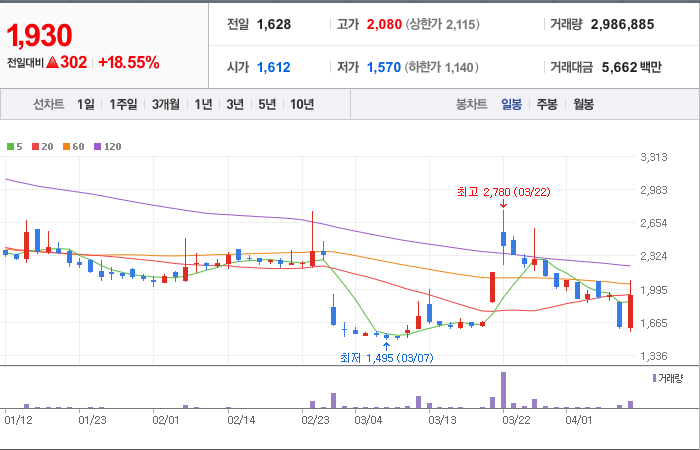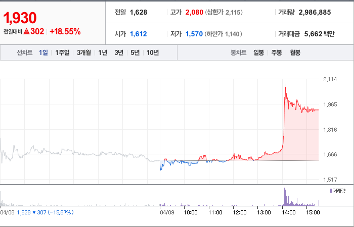 현재가: 1,930, 어제대비:+302시총: 811억원, 거래량:2,986,885, 거래대금:5,662백만