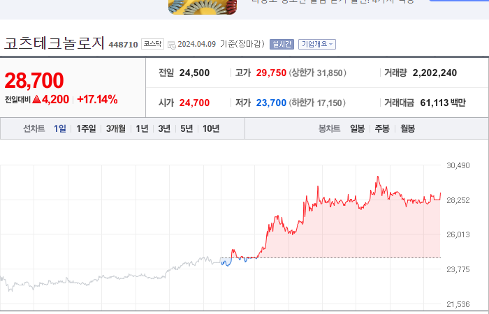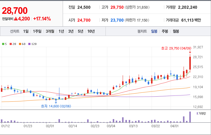 현재가: 28,700, 어제대비:+4,200시총: 1,458억원, 거래량:2,202,240, 거래대금:61,113백만